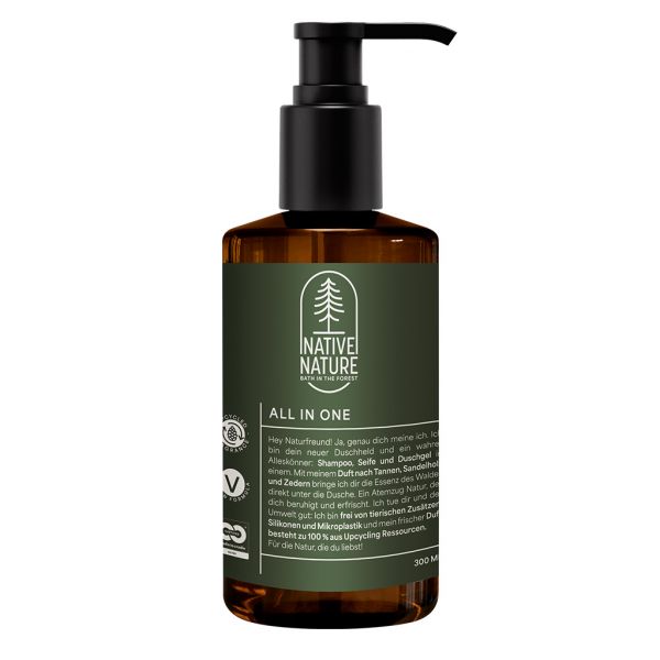Dorlotez votre peau et vos cheveux avec le tout-en-un relaxant de NATIVE NATURE. Sa formule vegan à base d'ingrédients naturels nettoie en douceur tout en prenant soin de votre peau. Elle est bonne pour vous et pour l'environnement : elle ne contient aucun ingrédient d'origine animale, de silicone ou de microplastique, tandis que son parfum est fabriqué à partir de ressources 100 % recyclées. Par amour pour la nature ! NATIVE NATURE Depuis toujours, la forêt a un effet apaisant et relaxant sur l'esprit humain. Les bains de forêt et leurs effets curatifs sur l'être humain font l'objet de recherches scientifiques au Japon depuis plusieurs décennies. Native Nature s'appuie sur ces recherches. FORMULATION - pH neutre pour la peau, vegan, testé dermatologiquement et certifié Cradle to Cradle Silver® - Sans parabènes, silicones, microplastiques ni huiles minérales - Parfum composé à 100 % d'huiles végétales recyclées : cyprès, aiguilles de pin et bois de cèdre FLACONS-POMPES - Flacons : en plastique PCR et recyclables jusqu’à 100% - Pompes : pompes hygiéniques mono-matériau d’ADA avec système de drainage breveté pour un recyclage complet et une hygiène irréprochable